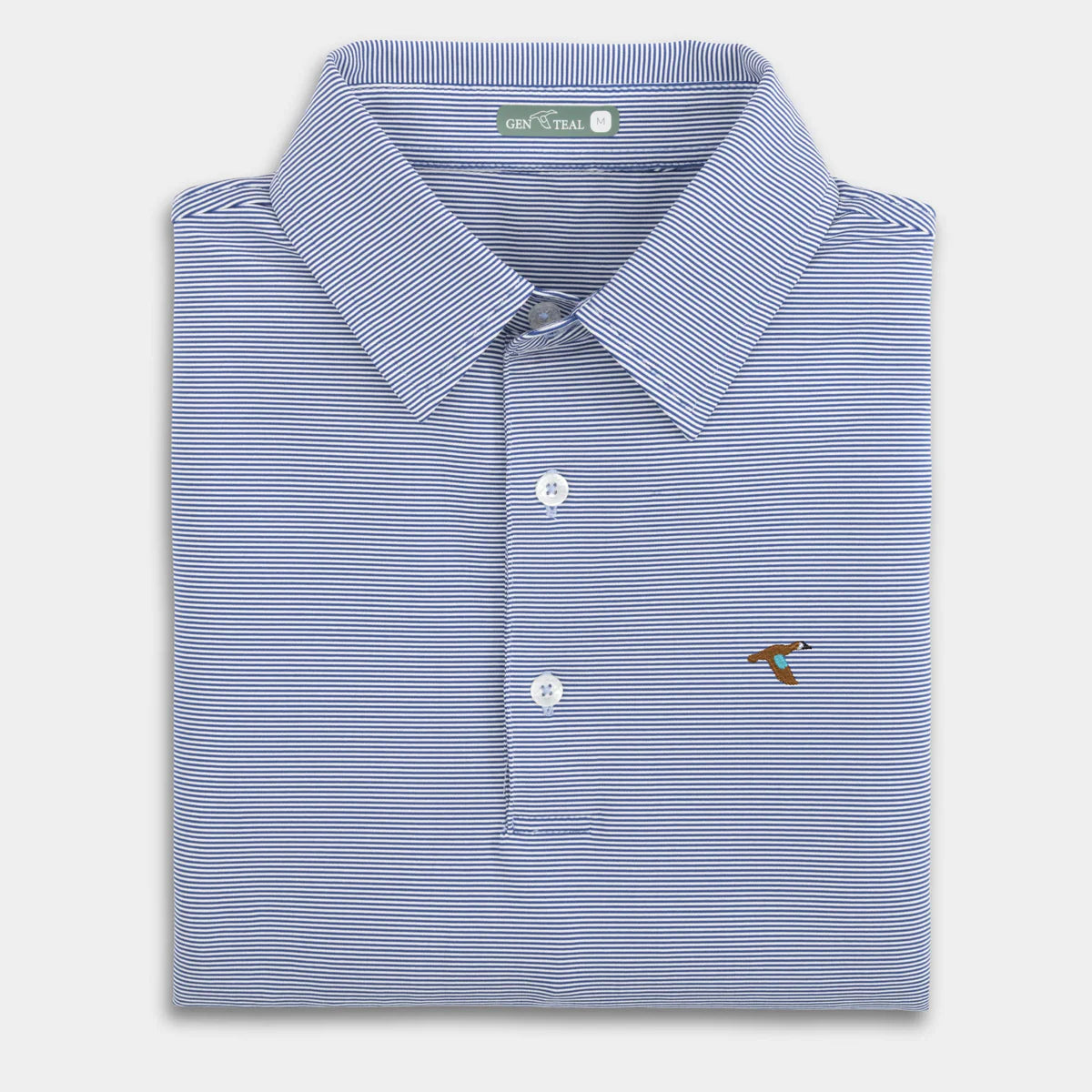 The Clubhouse Performance Polo features a classic stripe and our signature Blue-winged Teal logo embroidered at the left chest for a refined finish. Crafted from a lightweight performance fabric, it delivers breathable comfort, moisture-wicking capability, and just the right amount of stretch for all-day ease. A structured collar and classic fit keep the look sharp from the course to casual weekends.